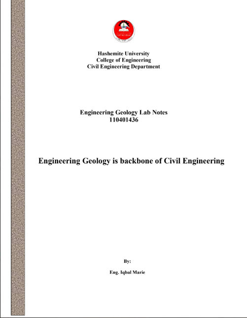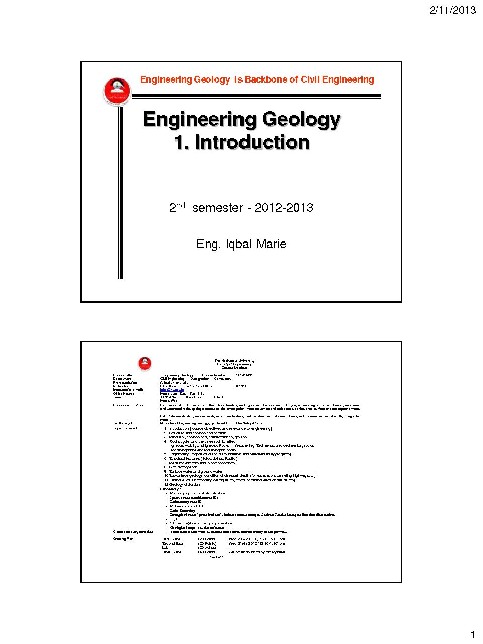 تتناول هذه المادة المواد المكونة للكرة الأرضية، مركبات الصخور وخصائصها، أنواع الصخور وتصنيفها، دورة الصخور، الخصائص الهندسية للصخور، عوامل تشكيل الصخور وتعريفها، التراكيب الجيولوجية، استطلاع المواقع، حركات الصخور واستقرار الميول الصخرية، الزلازل، المياه السطحية والجوفية.الخرائط الطبوغرافية و الجيولوجية