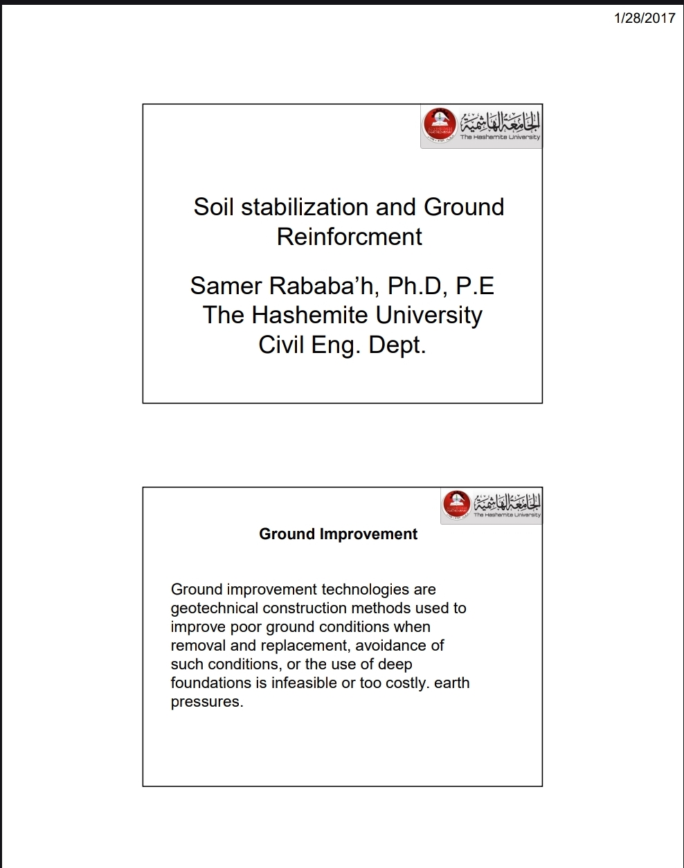 الدمك الديناميكي، الدمك بالاهتزاز، الدمك مع الضخ، التحميل الابتدائي مع تصريف المياه، الدمك بالتفجير، أعمدة الإسمنت والجير، أعمدة الصخور الاهتزازية، أعمدة الخرسانة الاهتزازية، الضخ الإسمنتي، الخلط العميق، الخوازيق الصغيرة، دعائم الأرض، التسليح باستخدام الفايبر، الجدران الاستنادية المدعمة، استخدام المواد الجيوصناعية، ضخ المياه خارج التربة، المواد الكيميائية والصناعية لتثبيت التربة، الأعمدة الرملية.